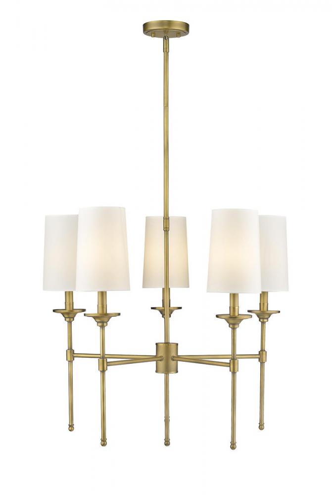 Transform a traditional dining room with the Emily chandelier. Sleek and elegant, this metal chandelier features five off-white cloth shades affixed to a slim, steel frame. Complete with a rich, rubbed brass finish, this fixture beautifully illuminates a room with soft, diffused light.