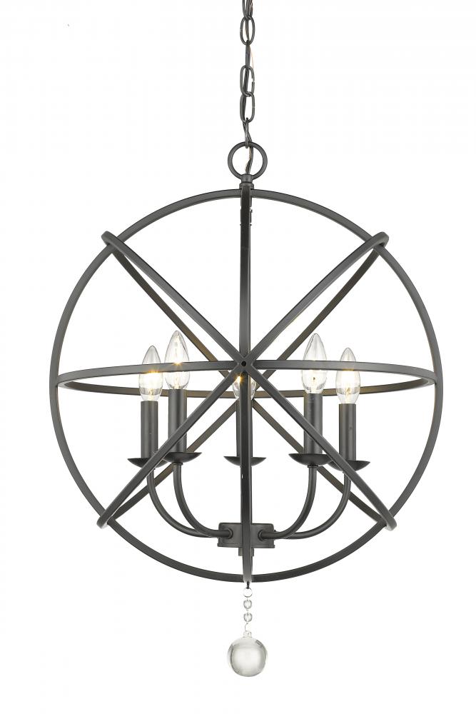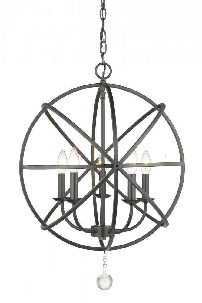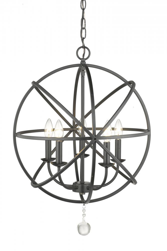 Fun contemporary style with a space-age twist adds character to this matte black orb-shaped five-light chandelier. Custom finish options allow a perfect palette that complements your d?cor personality, and a charming strand of dangling crystal balls changes up its rugged personality.