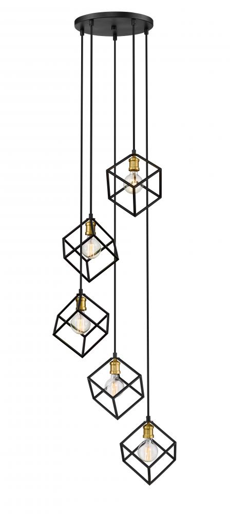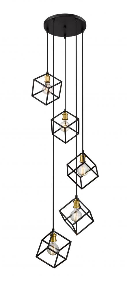 A sense of movement and energy are conveyed in the design of this two-tone five-light pendant for your home. Its fashioned in a bronze and olde brass finish with cube-shaped shades hanging at different heights for an electric look and feel that youll love. Itll add a vibrant dynamic to any dining room, foyer, living room, or entertainment room.