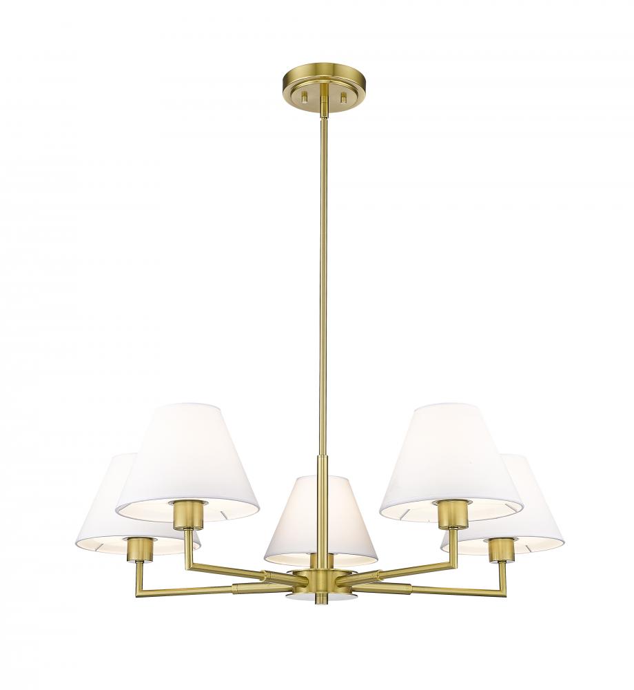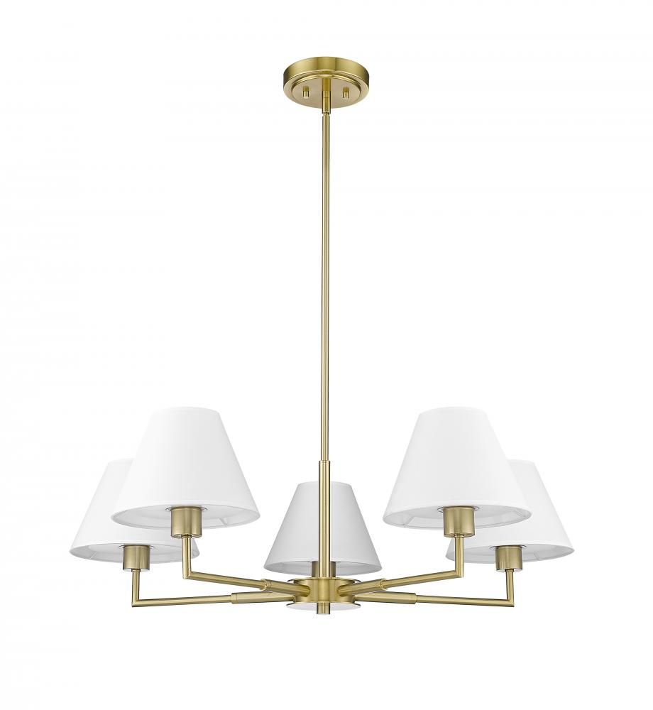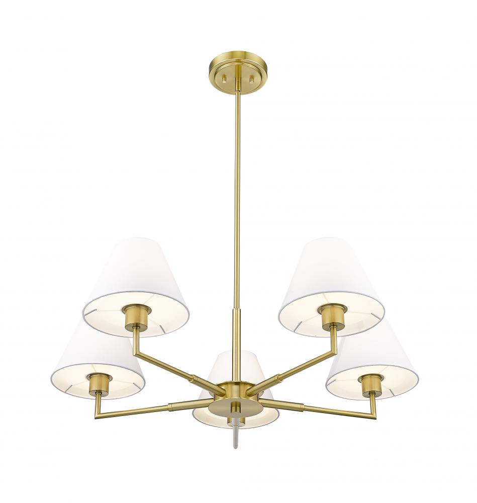Modern flexibility of design plays up the chic, understated character of a five-light chandelier. Expertly designed with simplicity at the forefront, the chandelier pairs a rich luxe gold frame with straight suspension and complementary angularity, all capped with conical shades that create the perfect hint of dimensionality for a fixture that looks great everywhere from the dining room to a bedroom dressing area.