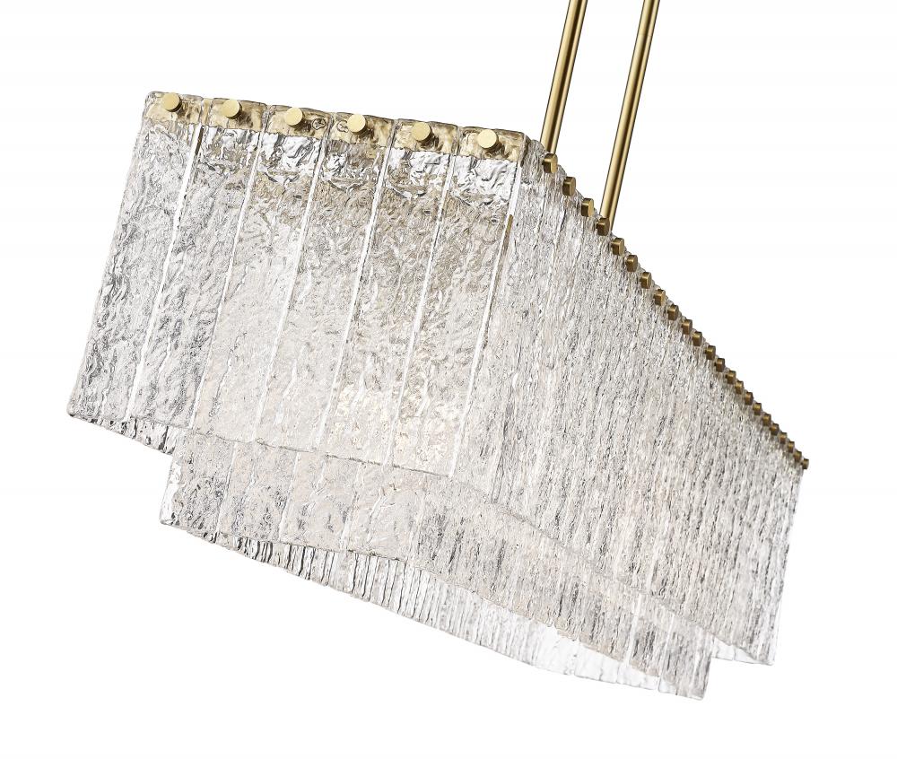 Embracing a glam aesthetic with surprising bold design elements, this five-light island light becomes a focal point in any modern or transitional space. The Glacier island light offers a decadent look of individual textured glass panels that emulate melting ice, an extraordinary effect with dramatic impact in a kitchen or bar setting. Lush modern gold finish steel creates a chic frame and canopy, adding consistency in both style and finish, embellishing the optical delight accomplished when the fixture is illuminated.