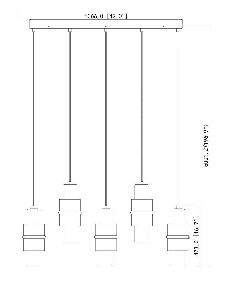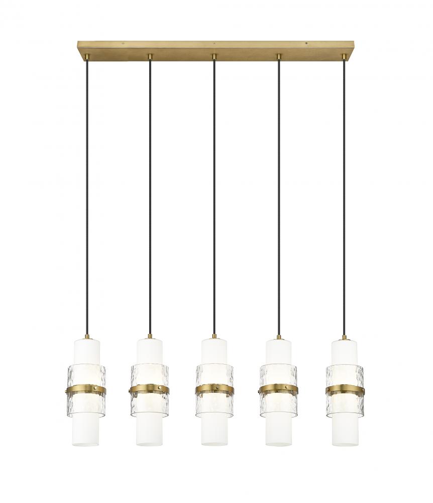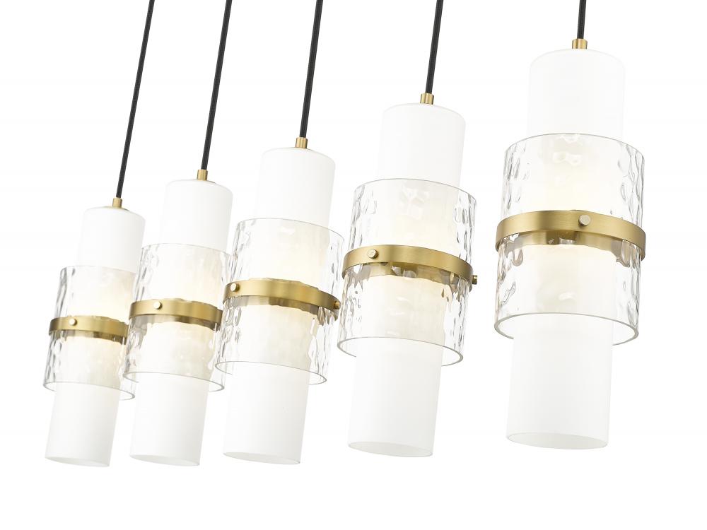 Put a sophisticated spin on an inviting kitchen with this modern five-light island chandelier. In a modern gold finish, it boasts a slim canopy and braided cloth covered cords, with a single row of delicate shades. Each features a center cylinder of etched opal glass complemented with clear textured glass that creates dimension and a metal cuff that adds artistry and elegance.