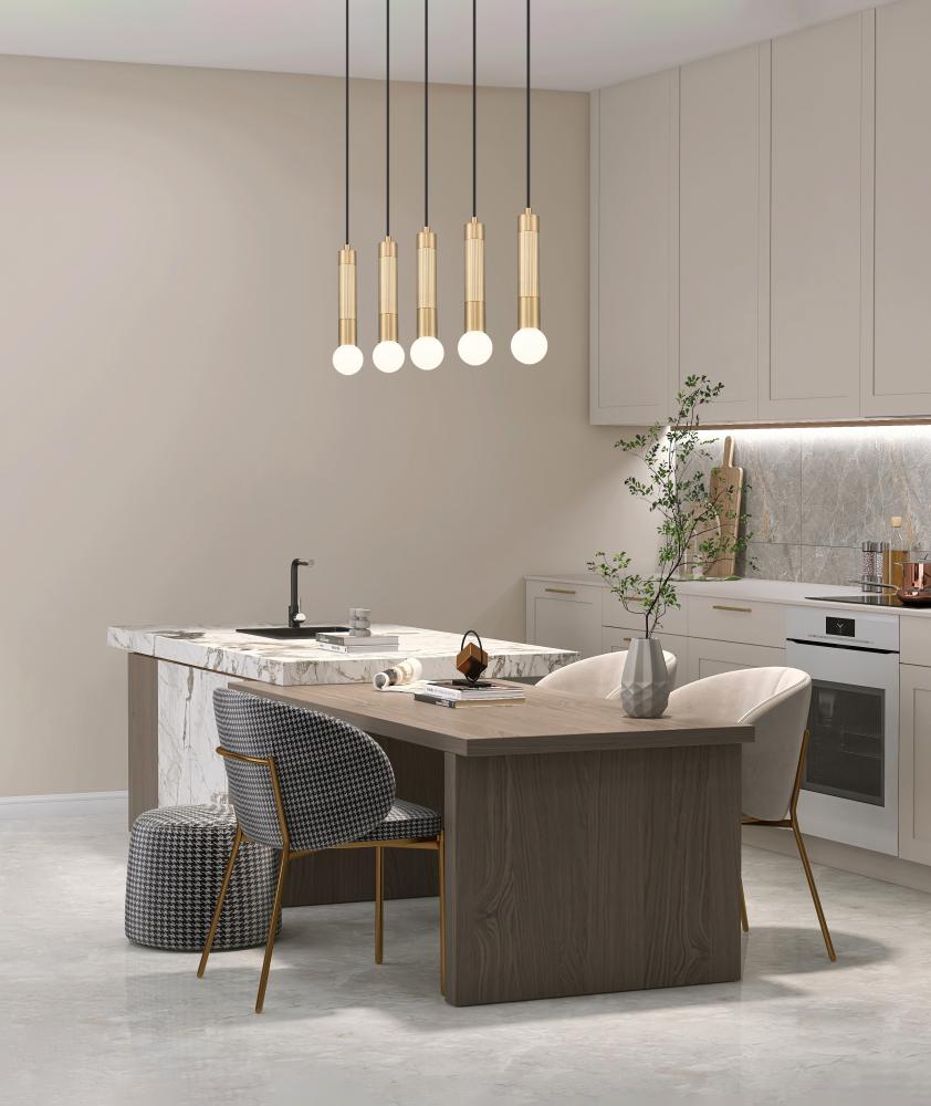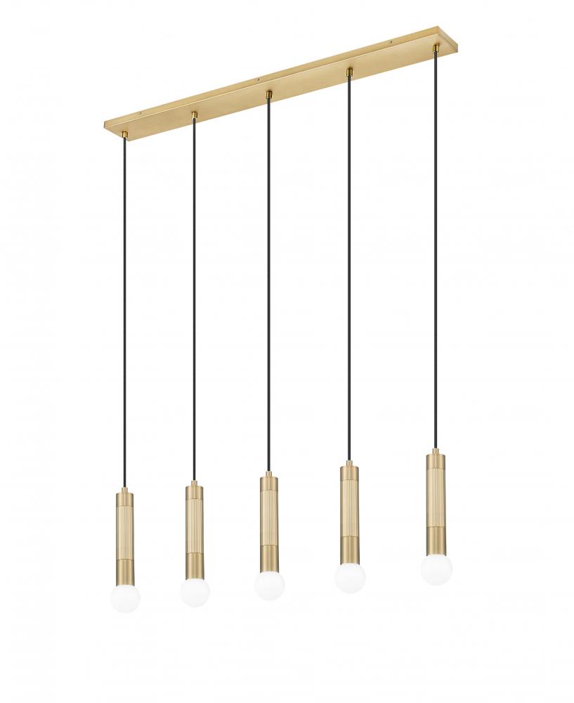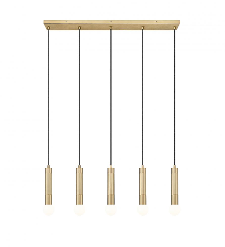 Center simplicity and sophistication with this modern five-light linear chandelier. Its modern gold finish gleams warmly in the light to ensure inviting ambiance and aesthetics over a kitchen island or dining table. Braided cords are an upgraded accent, while elongated tubes only enhance a streamlined profile.