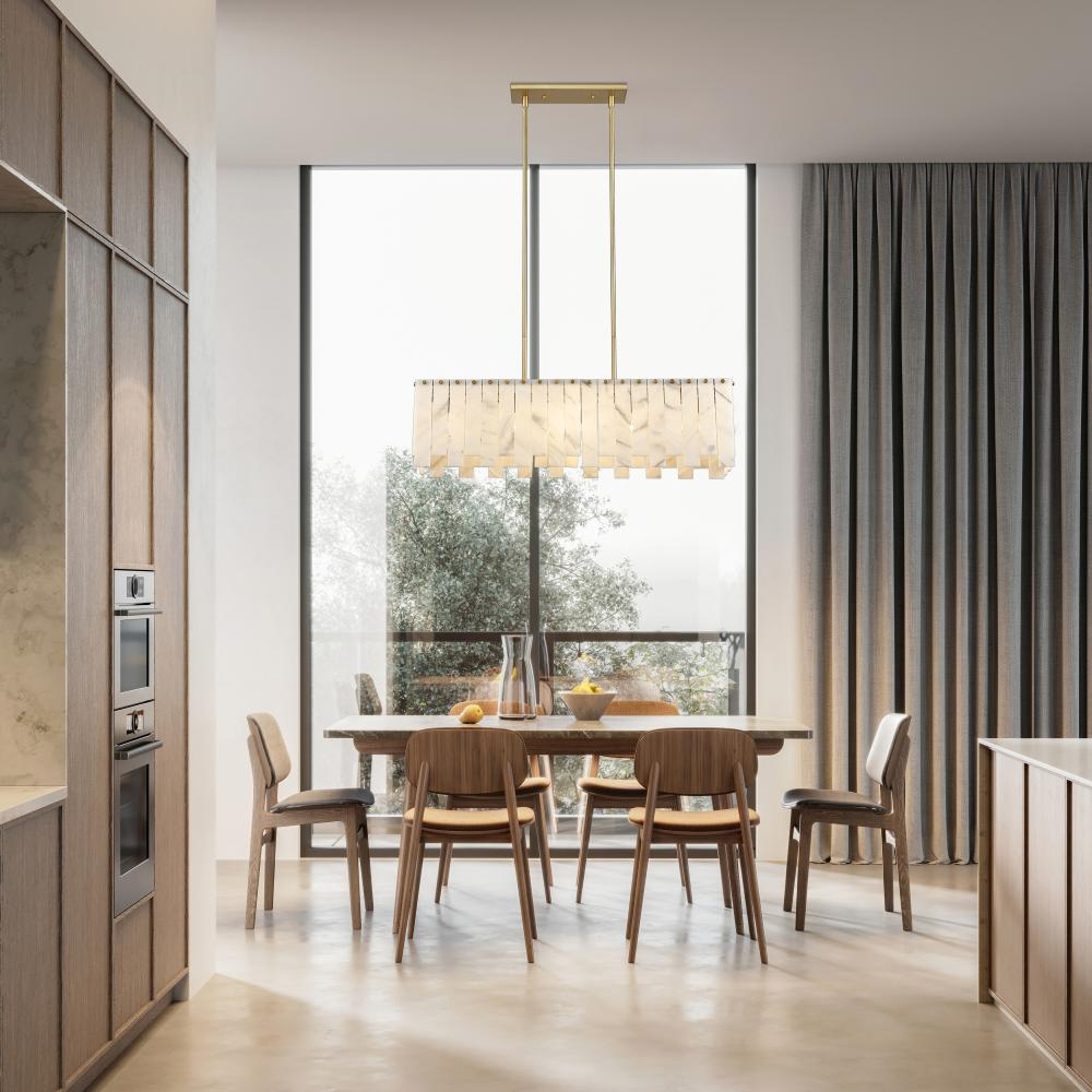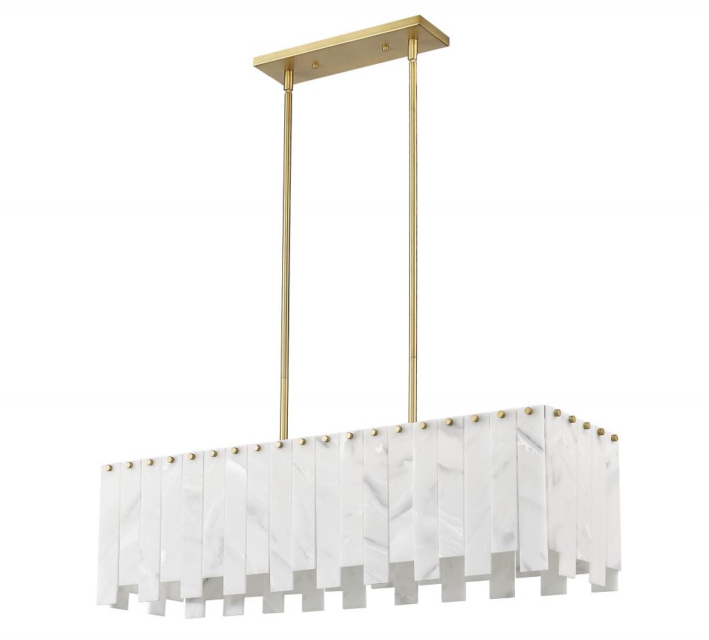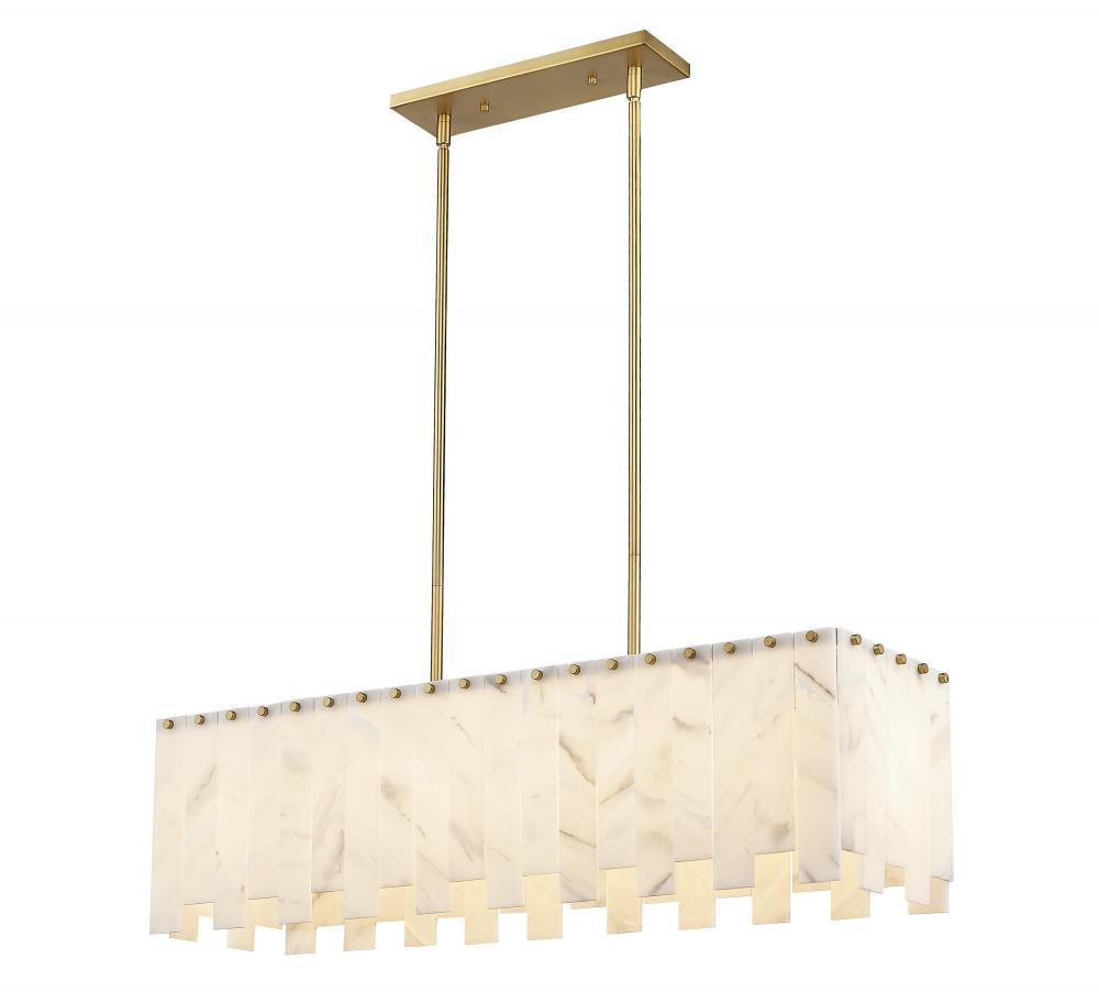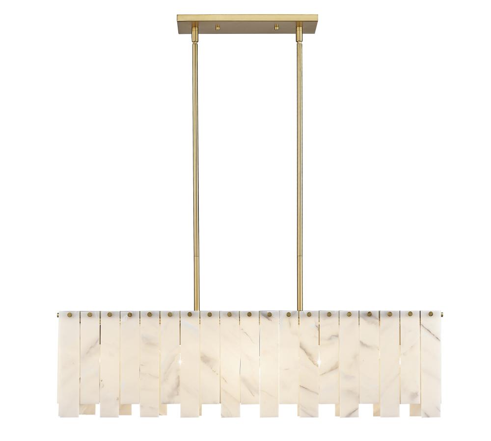 Embrace the personality-rich look of Art Deco style with a fixture that complements a modern or transitional space. Featuring tasteful alabaster-like strips alternating in length and arranged around a rectangular steel frame, this five-light island light delivers a versatile yet decadent look. Charming rubbed brass finish rivot detailing elevates this gallery inspired island light that goes with the flow as it complements a gritty rendition of toned-down glam in a modern kitchen or entertaining setting.