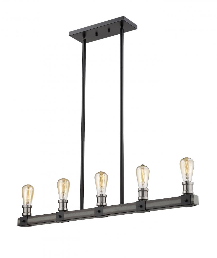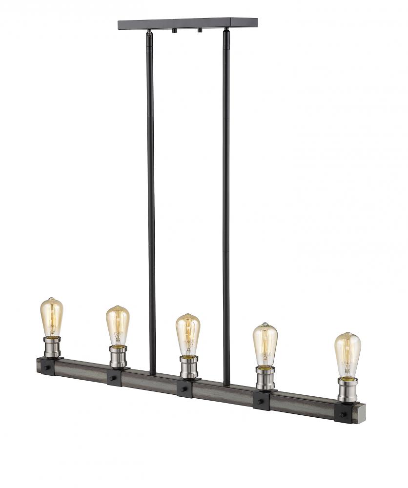 Great for a modern dining area, this five-light pendant light casts an industrial aura. A line of exposed lightbulbs brightens up the sleek silhouette with radiance against deep ashen tones.