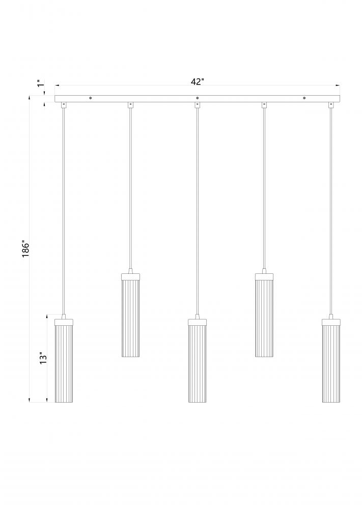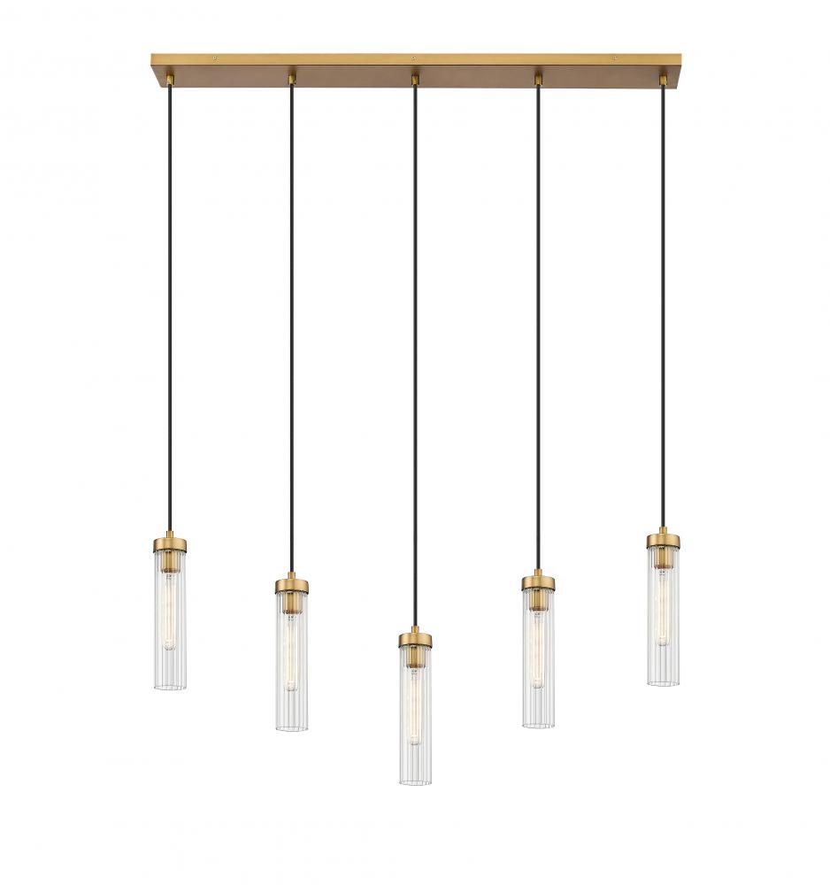 The design power of custom lighting intersecting with organic artistry offers unspoken elegance with a touch of minimalism and versatility. This five-light linear chandelier offers a row of delicate fluted glass shades that dangle in a graduated silhouette from a slender rubbed brass finish metal canopy and form an example of organic expressive style. Shaping becomes an important element in the visual impact of a classic fixture.