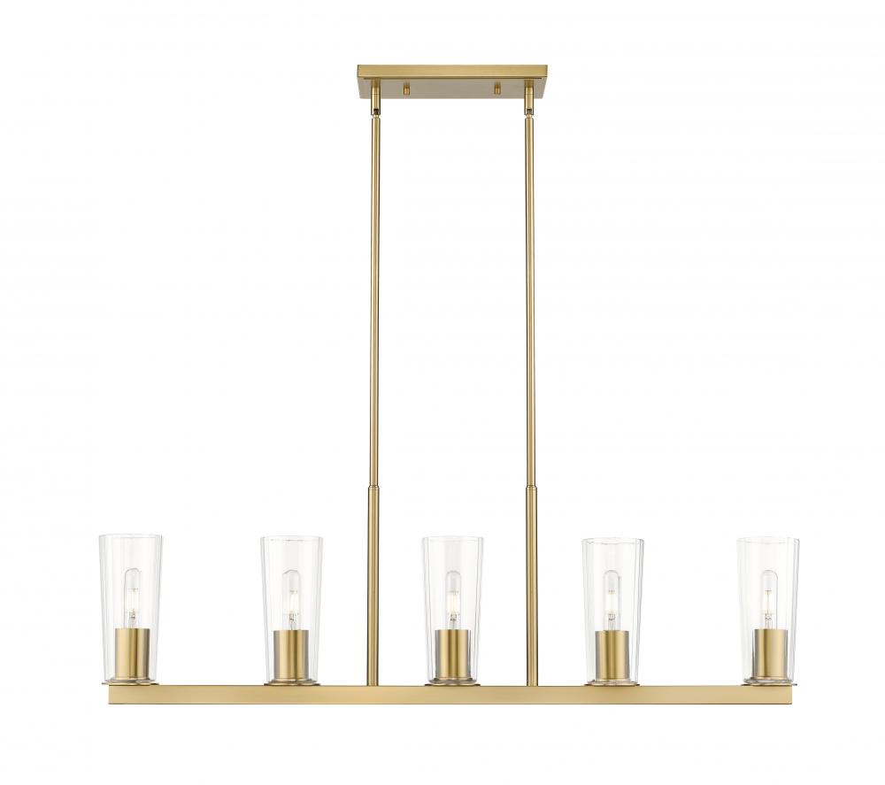 Introduce spectacular style with the refined presence of a modern industrial five-light linear chandelier. Ideal over a kitchen island or dining table, it boasts a long-lined profile complete with five tapered glass shades that offer bright, beautiful illumination. A modern gold finish lends elegant warmth, while tubular bulbs ensure a touch of vintage charm.