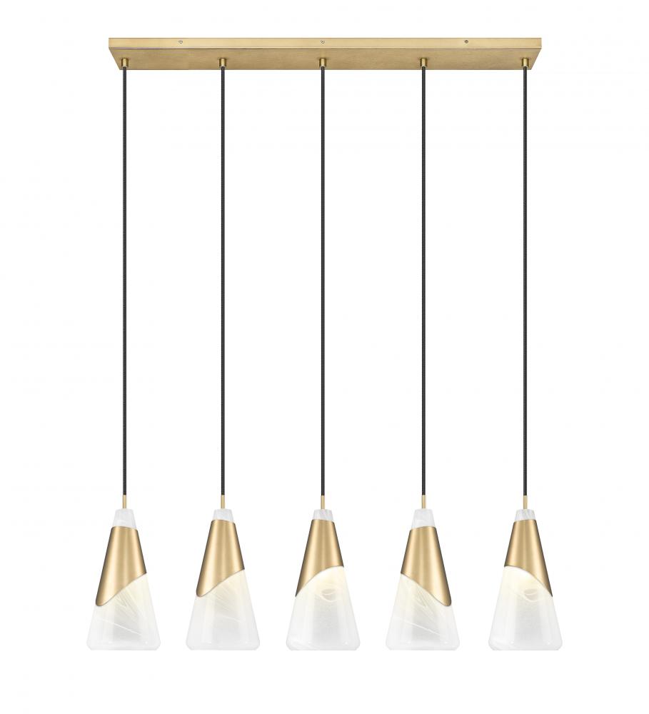 Curvy metal shrouds create the perfect dose of fluidity and movement in a modern five-light linear chandelier. Pairing a modern gold finish with icy swirled artisan glass, this fixture is a study in compelling contrasts, sure to enchant over a kitchen island or dining table.