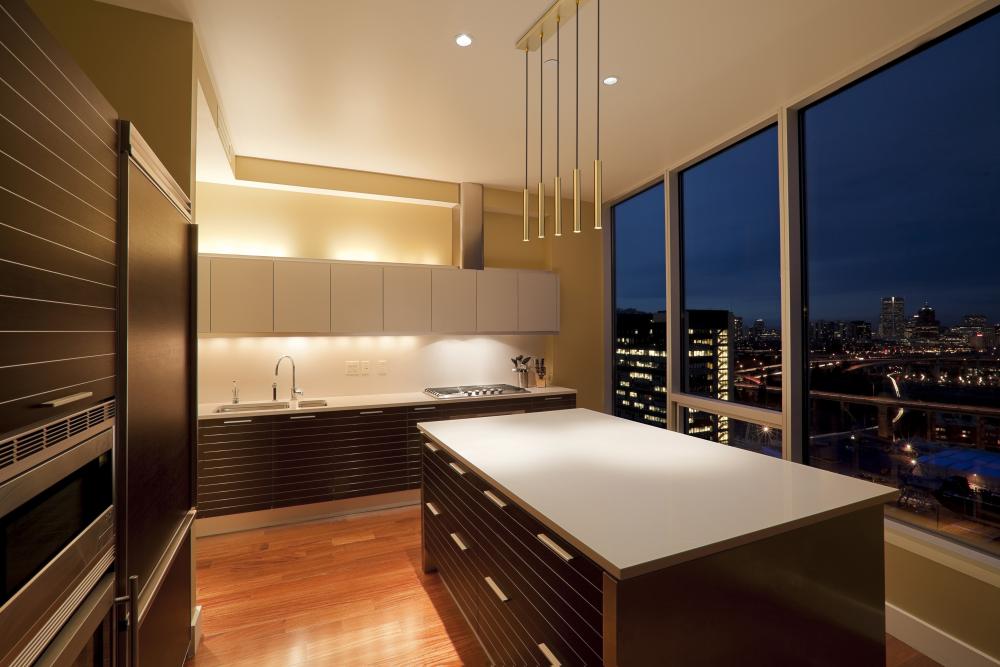 Embrace warm sophistication with a modern five-light linear chandelier from the Forest collection. Its a streamlined silhouette with a slender canopy and slim housings, all in a lovely warm modern gold finish over steel construction. Integrated LED lights are energy efficient and dimmable, perfect for a contemporary kitchen or dining room.