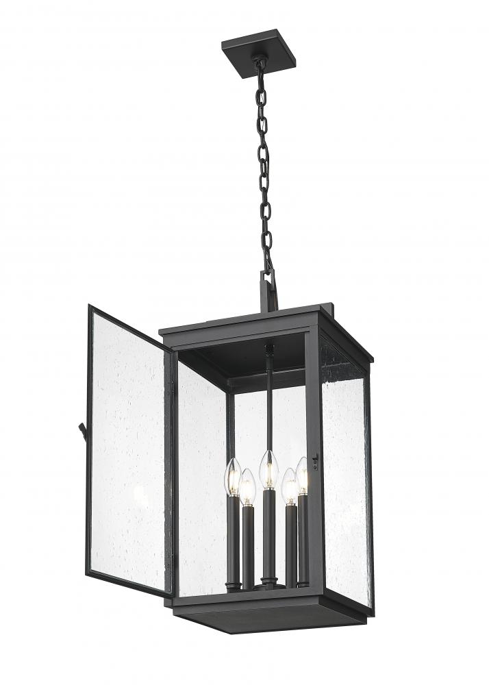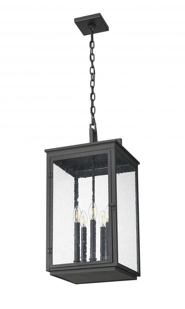Suspended in sand black and crowned with a bold, mission-inspired detail, this fixture floats like a lantern lost in time. Five candle-style lights glow behind clear seedy glass, casting warm, dappled light with every breeze. Its chain-hung design adds presence without heaviness.
