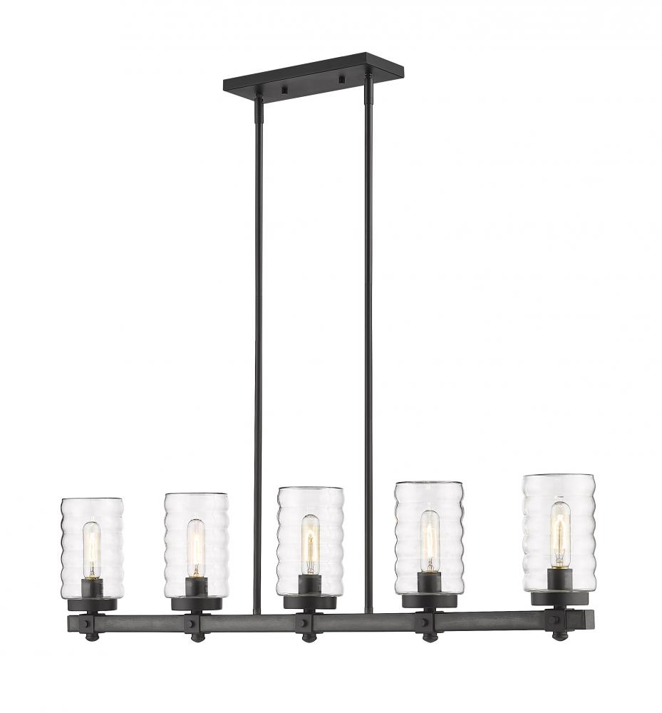 Entertaining al fresco steps up its pace when fashionable d?cor elements come along for the ride. The Tahoe five-light outdoor linear island light creates a cluster of charming jar-like clear cylindrical shades, arranged evenly over mounts, a frame, and accents made of ashen barnboard finish steel. Silhouetting reflects a clean minimal motif with industrial influence.