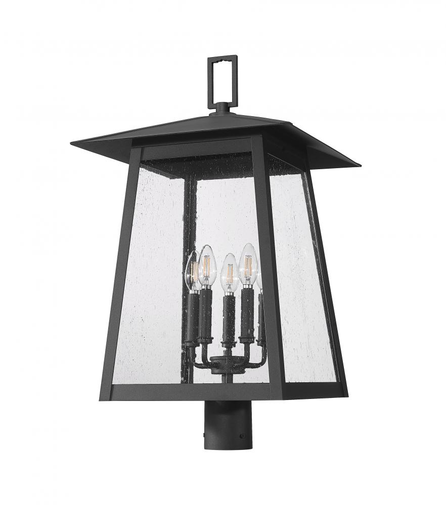 Showcasing a classic lantern-inspired silhouette to augment exterior gardens and walkways, this modern five-light outdoor post mount fixture promises a sophisticated aesthetic. Perfect for topping a post, this fixture features a Coastal black painted finish over aluminum, with clear seedy glass panels that offer vintage character. This dimmable outdoor light raises the level of elegance in a custom outdoor setting.