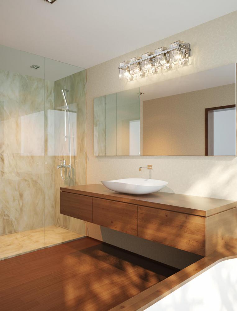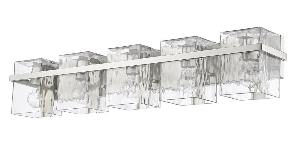 Rippled clear glass shades serve as a focal point on this five-light vanity. The fixtures steel is enhanced with a brushed nickel finish while captivating with clean lines.