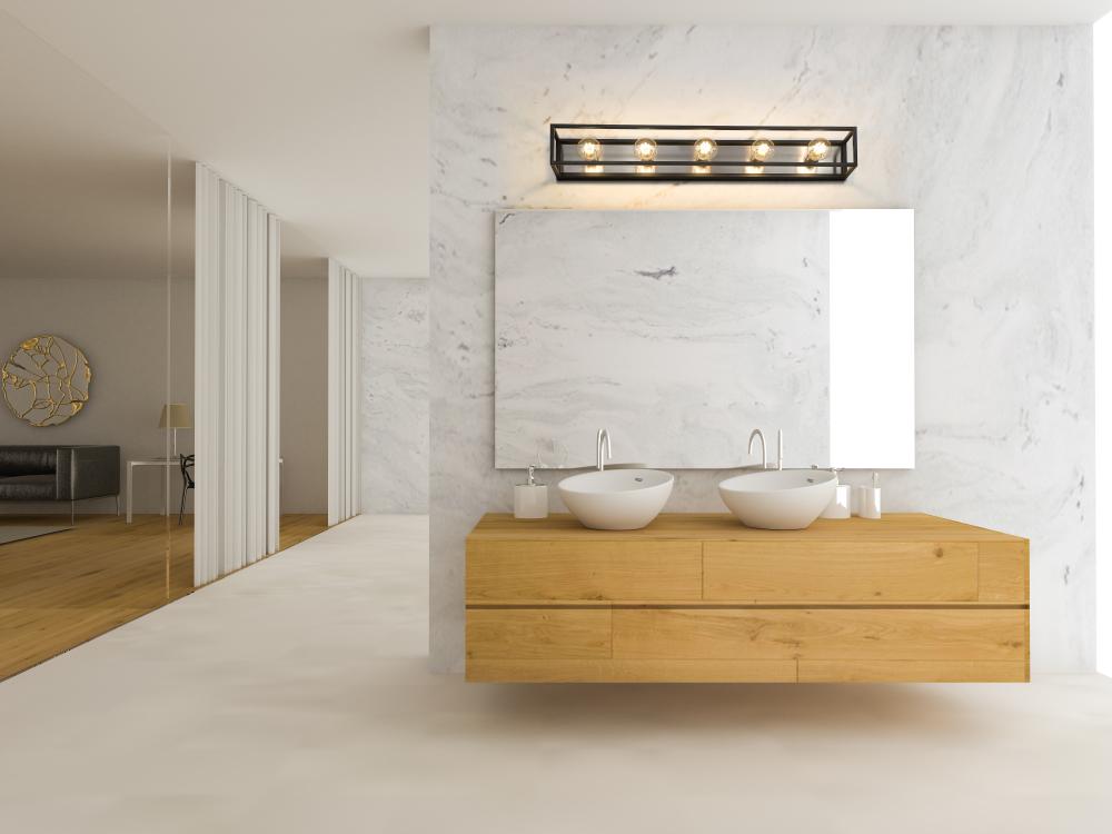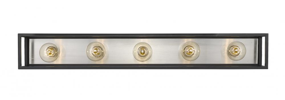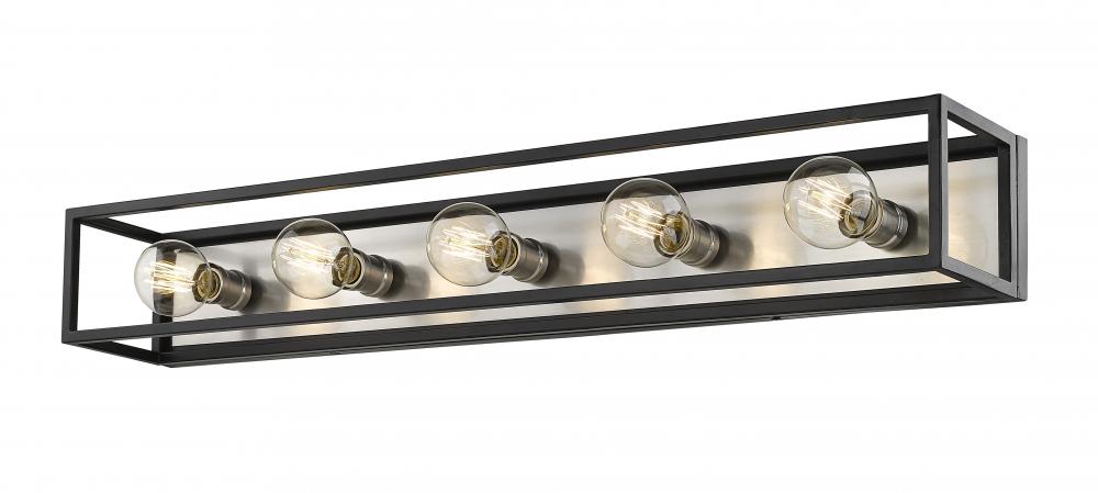 Youll love the ambiance that this two-tone five-light vanity imparts to your favorite space. It features a matte black and brushed nickel finish with an austere rectangle design that provides plenty of light. The bold, edgy design really energizes a bathroom or powder room.