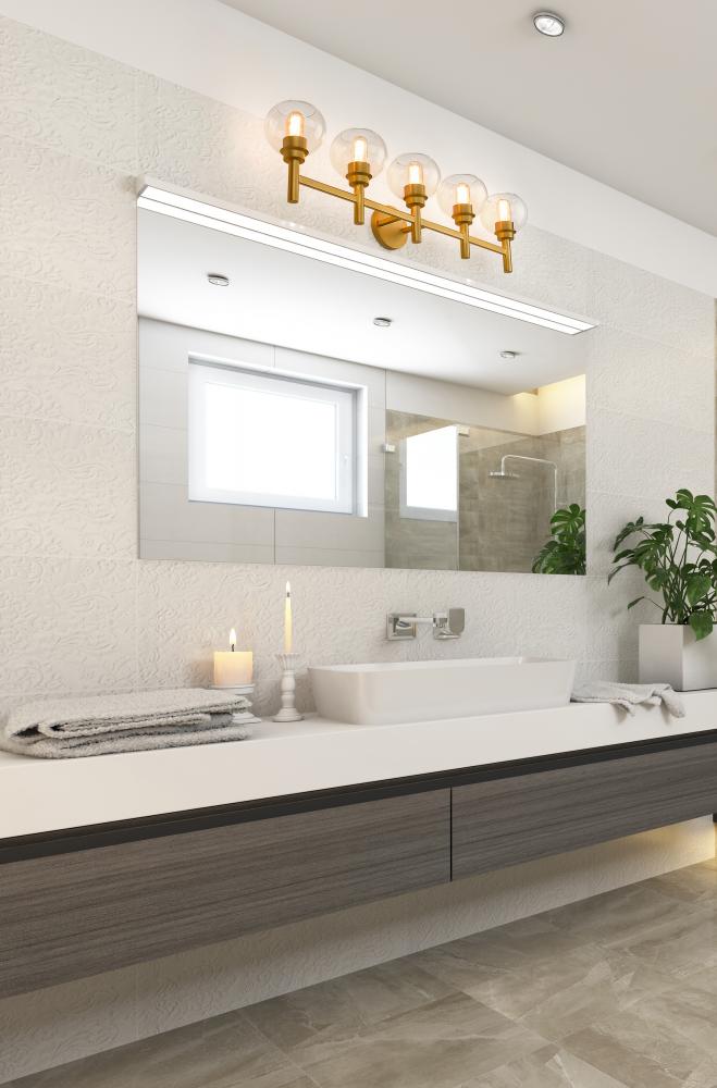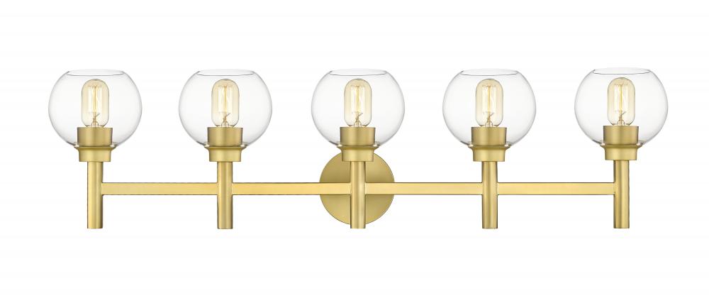 Span a graceful double vanity space with the exacting precision of a modern five-light vanity wall light. Designed inspirations come from the perfect form of a circle, comprised of open-edged globe shades in clear glass. Torch-style framework and a round wall plate are crafted in steel and receive a warm olde brass finish for timeless elegance.
