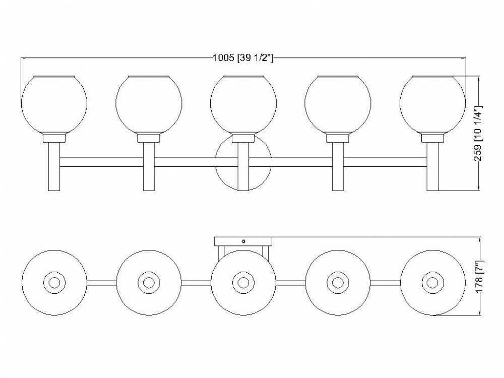 Is there anything more perfect in design than a circle? The Sutton bath series embraces the familiar shape in its backplate and echoed by the open-edge globe shades that can be mounted up or down. Available in 1- to 5-light versions in a choice of Matte Bl