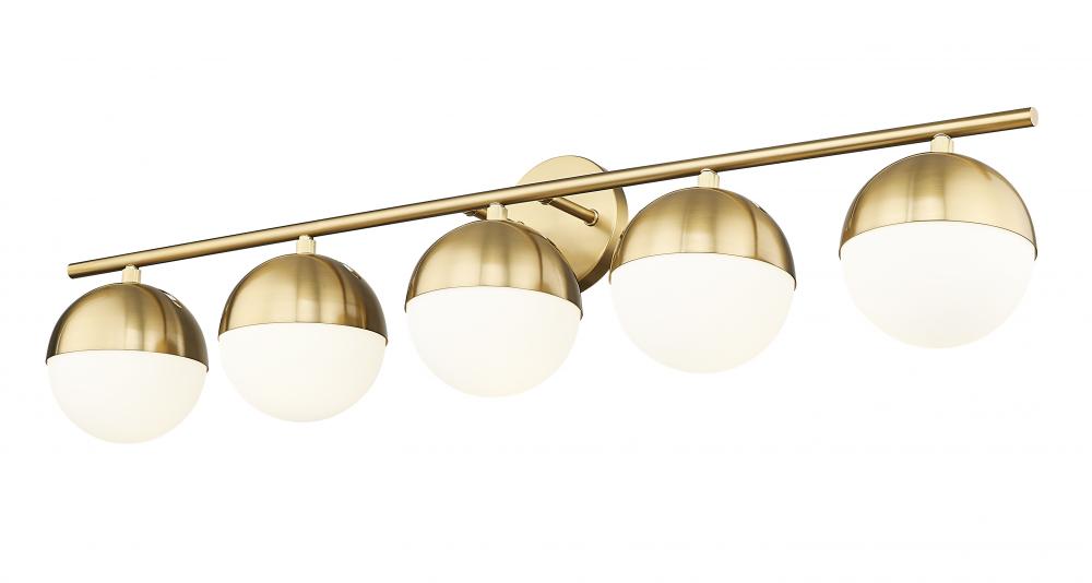 Modern gold sets a warm, inviting tone for this mid-century five-light vanity bath light. Its vintage inspirations are evident in orb shades and metal shields, complete with matte opal glass for soft, inviting illumination thats perfect for both ambiance and grooming tasks.