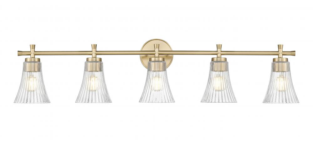 A modern gold finish brings warmth to this five-light vanity fixture, while fluted clear glass adds sparkle and delicate dimension. The curved shades glow like sculpted crystal, creating a light that feels both uplifting and refined. Every detail lends a sense of soft luxury that elevates the everyday.