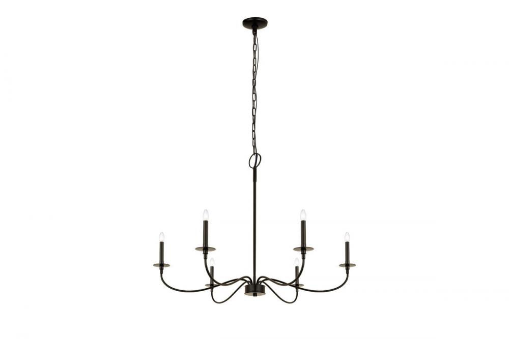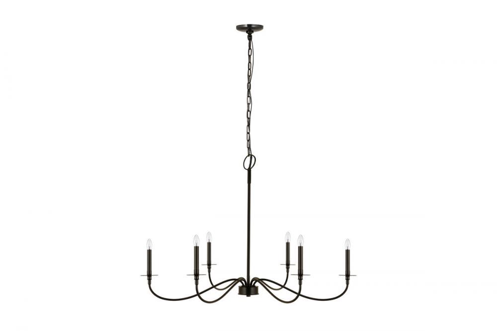 Bring romance to a modern or traditional kitchen, dining area, or main living space with this six-light chandelier from the Arrington collection. Crafted of bold matte black finish steel, its long, flared arms create a careful arrangement for placement of candelabra-style bulbs that borrow from a traditional motif.