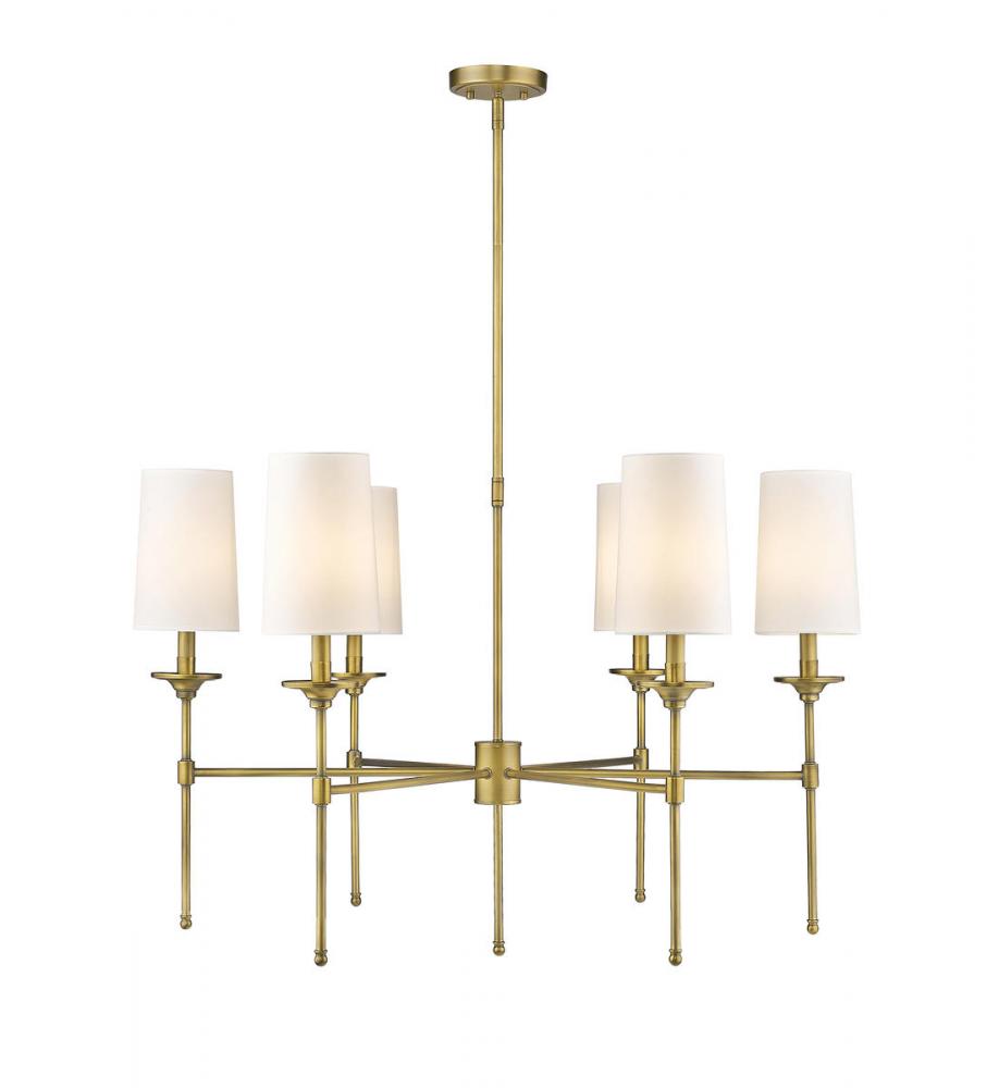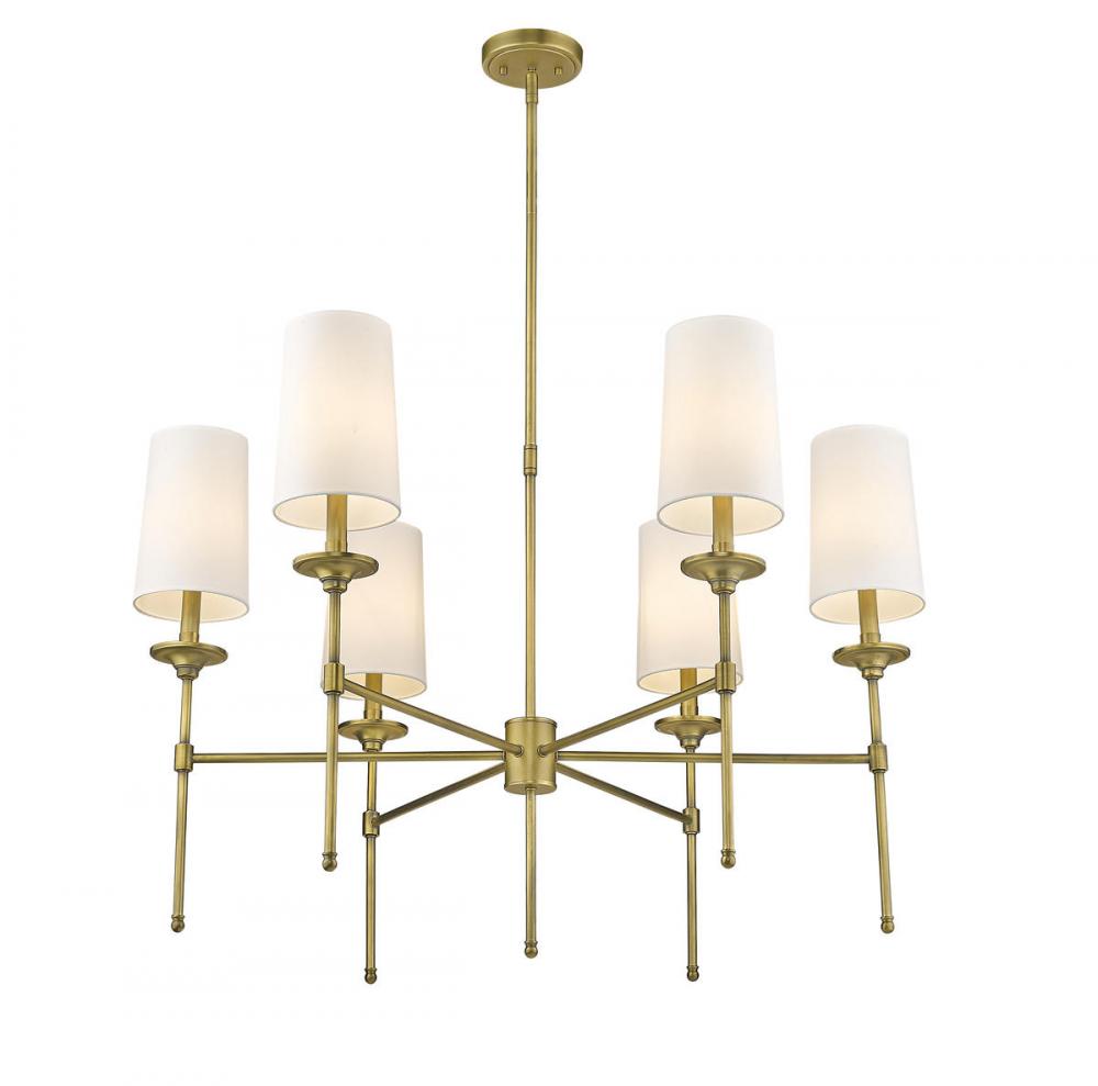 A tasteful addition to a traditional dining room, the Emily chandelier creates an inviting ambiance with its five off-white cloth shades. Treated to a gleaming rubbed brass finish, this metal chandelier flaunts a sleek silhouette that enhances a room with classic elegance.