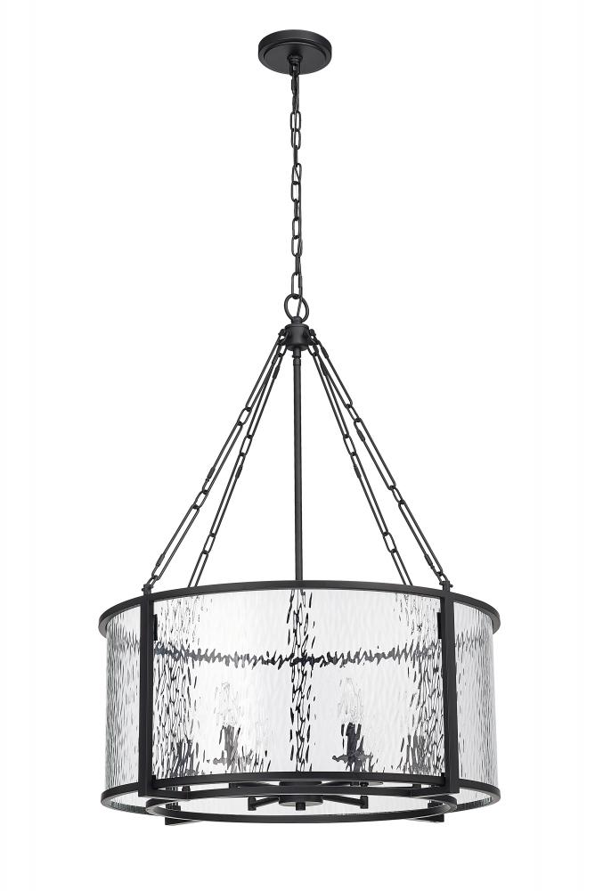 An unmistakable statement-making vibe becomes a focal point in any space when this captivating fixture delivers glowing ambient light with its own dramatic stamp. This six-light pendant from the Barrington collection is styled around an enticing energy and an industrial motif with a round cage made of matte black finish steel framing clear waterglass that distorts a view of romantic candelabra bulbs creating a castle-inspired look. Removable chain links and rod allow for a reduction in fixture height to 25.75 if desired.