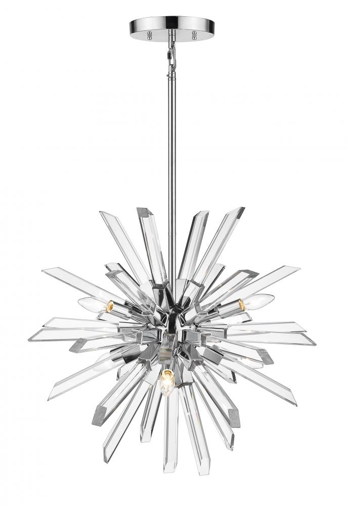 An explosion of stunning K5 crystal rods capture attention and are complemented with a glimmering chrome finish. This radiant six-light pendant shows off a sophisticated look and delivers exceptional illumination to an entry or dining room.