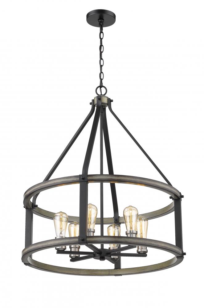 Featuring a cage-inspired frame, this six-light pendant light completes a modern motif. The faux barnwood construction is sleek with an ashen hue and exposed lightbulbs.