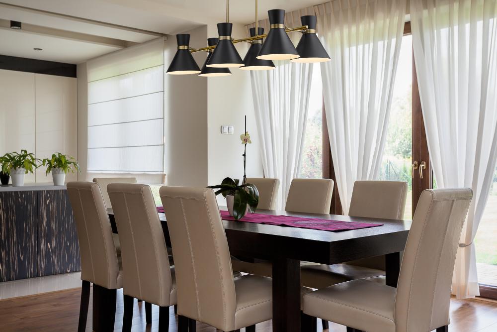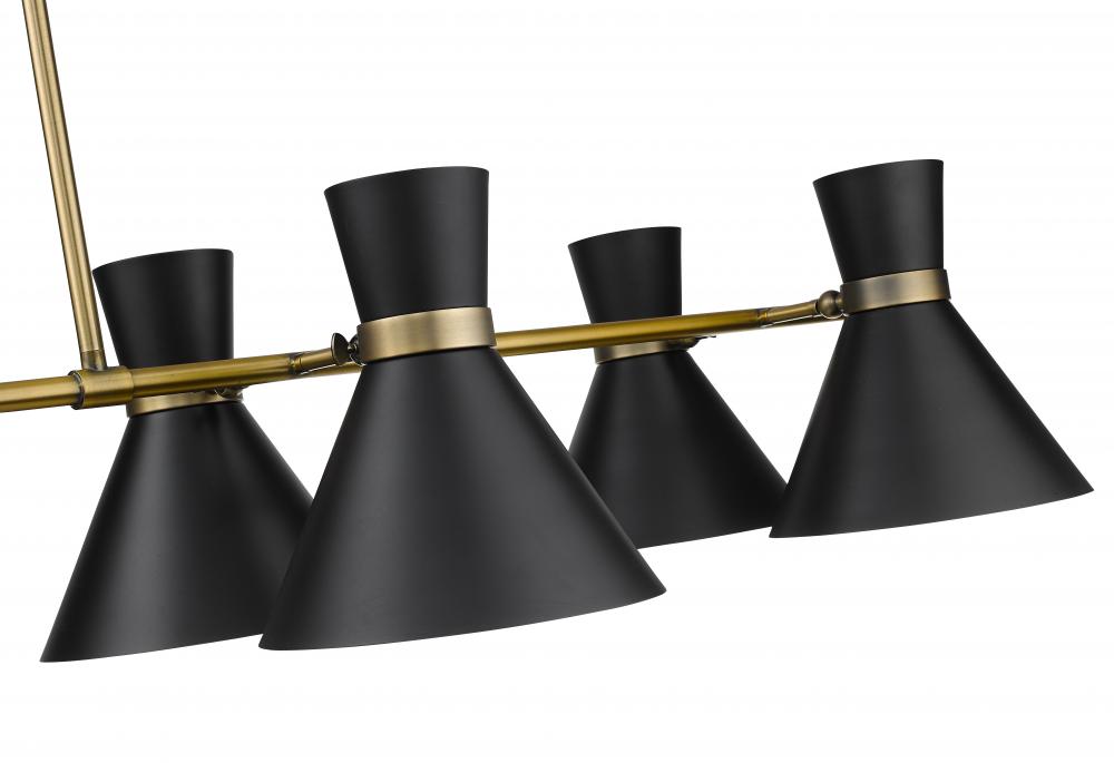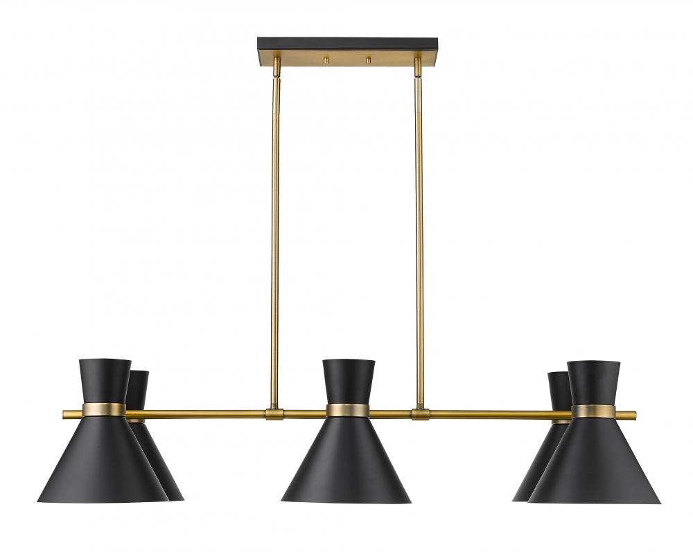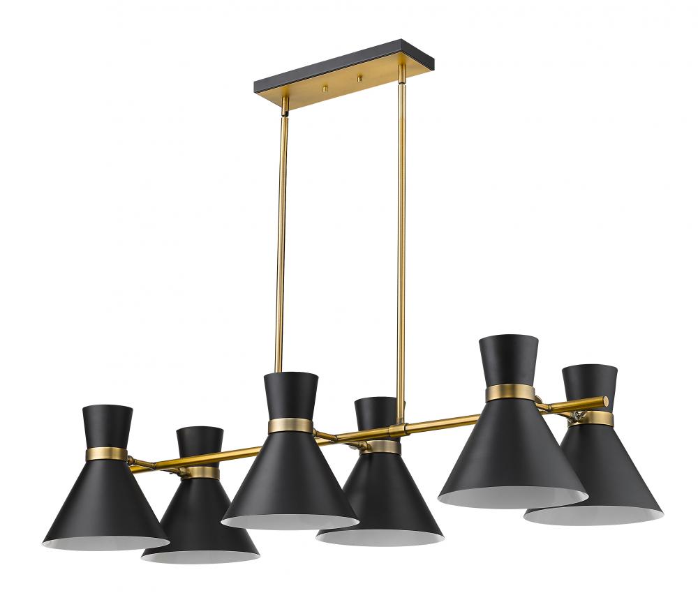 A decorative linear silhouette shapes industrial influence that adds casual elegance to this matte black finish steel six-light island/billiard light. Dress up a kitchen or sports entertaining space with this tasteful fixture trimmed with heritage brass finish steel. This sleek island fixture reflects the heart of romantic industrial charm.