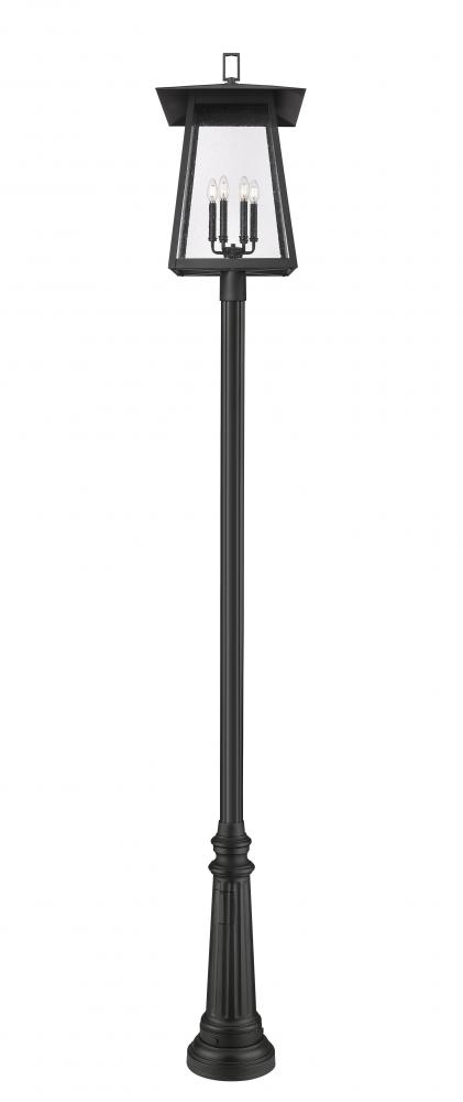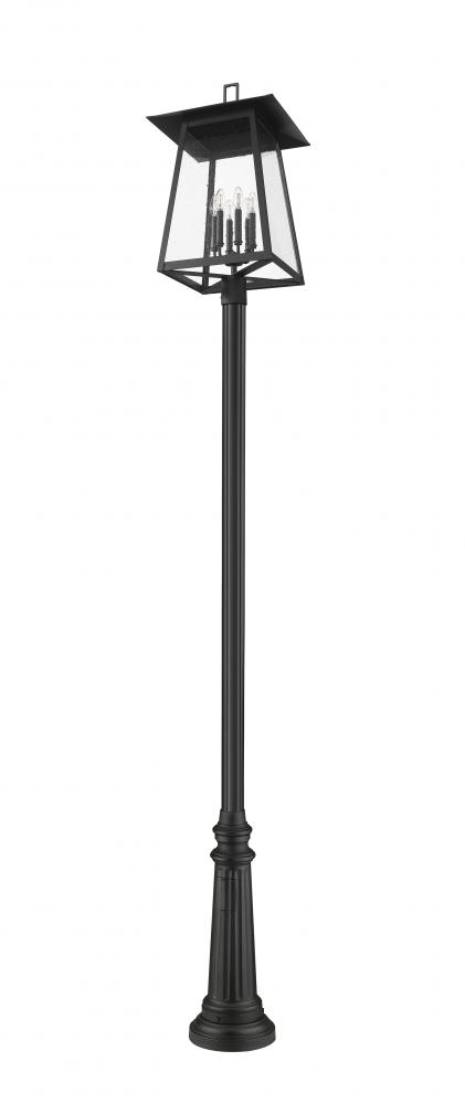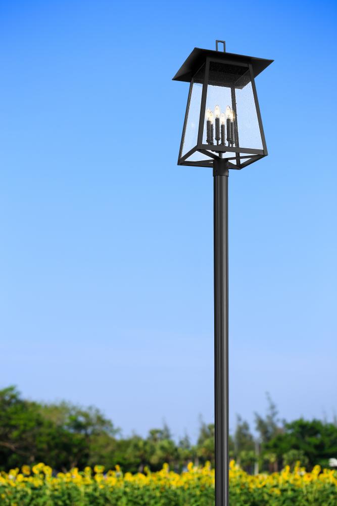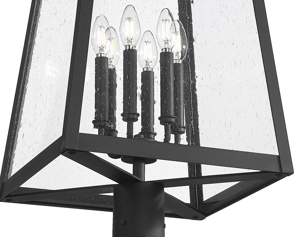 Illuminate a custom exterior space with romance as this six-light outdoor post-mounted fixture enhances front or back landscaping. Its gently contoured pole silhouette and lantern motif showcase black finish aluminum, creating a smooth look and feel. The lantern is enhanced with clear seedy glass panels and a candelabra light mount that combine to deliver a touch of vintage character to your exterior.