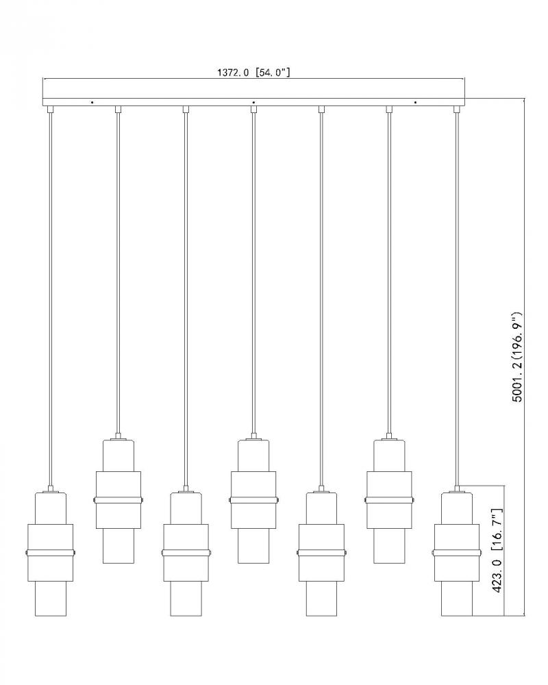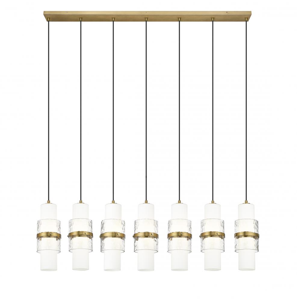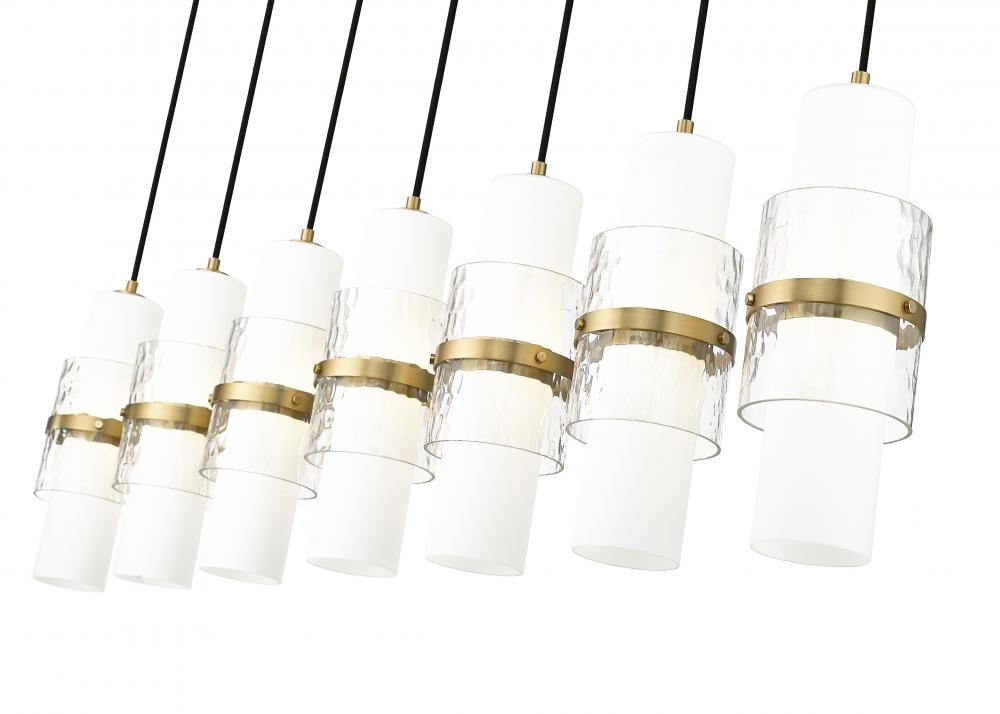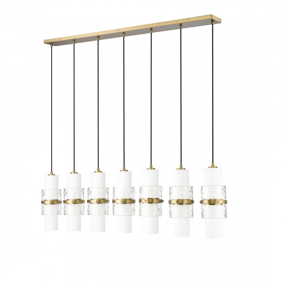A modern seven-light island chandelier introduces sophisticated energy and elegance in an inviting kitchen. In a modern gold finish, it boasts a slim canopy and braided cloth covered cords, with a single row of delicate shades. Each features a center cylinder of etched opal glass complemented with clear textured glass that creates dimension and a metal cuff that adds artistry and elegance.