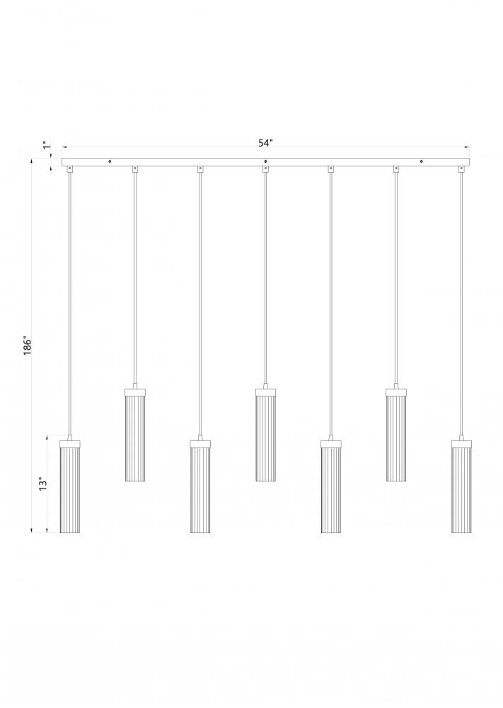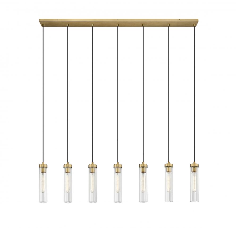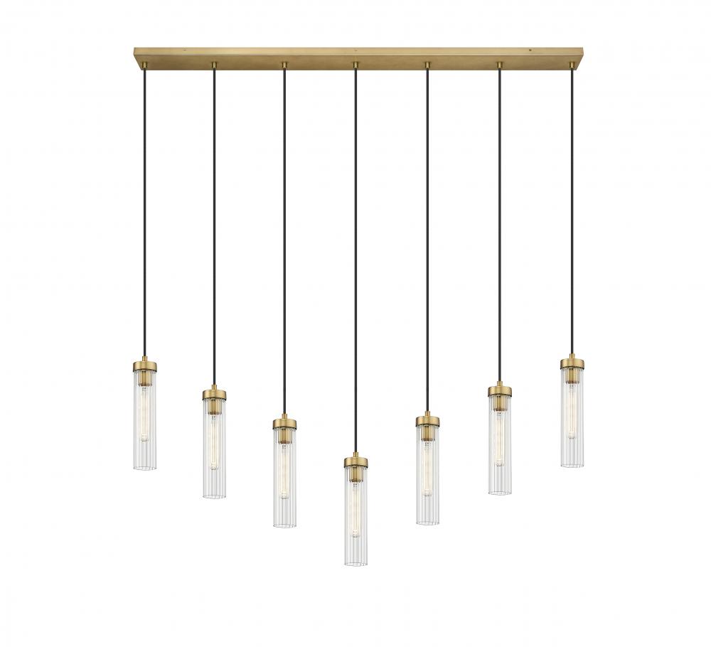 Welcome the orderly silhouetting and contrasting glam artistry of a light fixture with design power. Choose this seven-light linear chandelier to make a statement in a custom contemporary space, embracing a careful arrangement of delicate fluted glass shades that dangle at graduated lengths from a rich rubbed brass finish metal canopy, delivering a captivating example of radiance and fluidity.