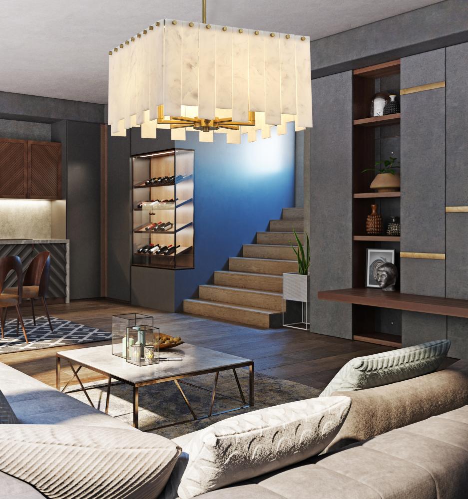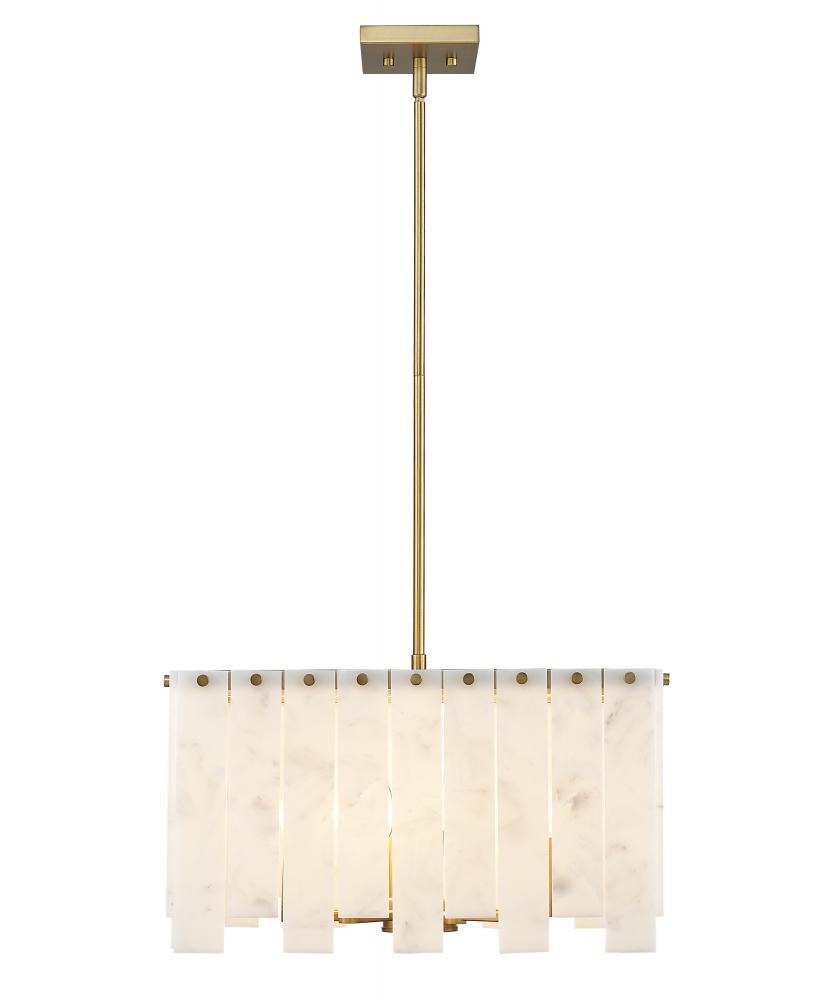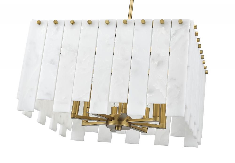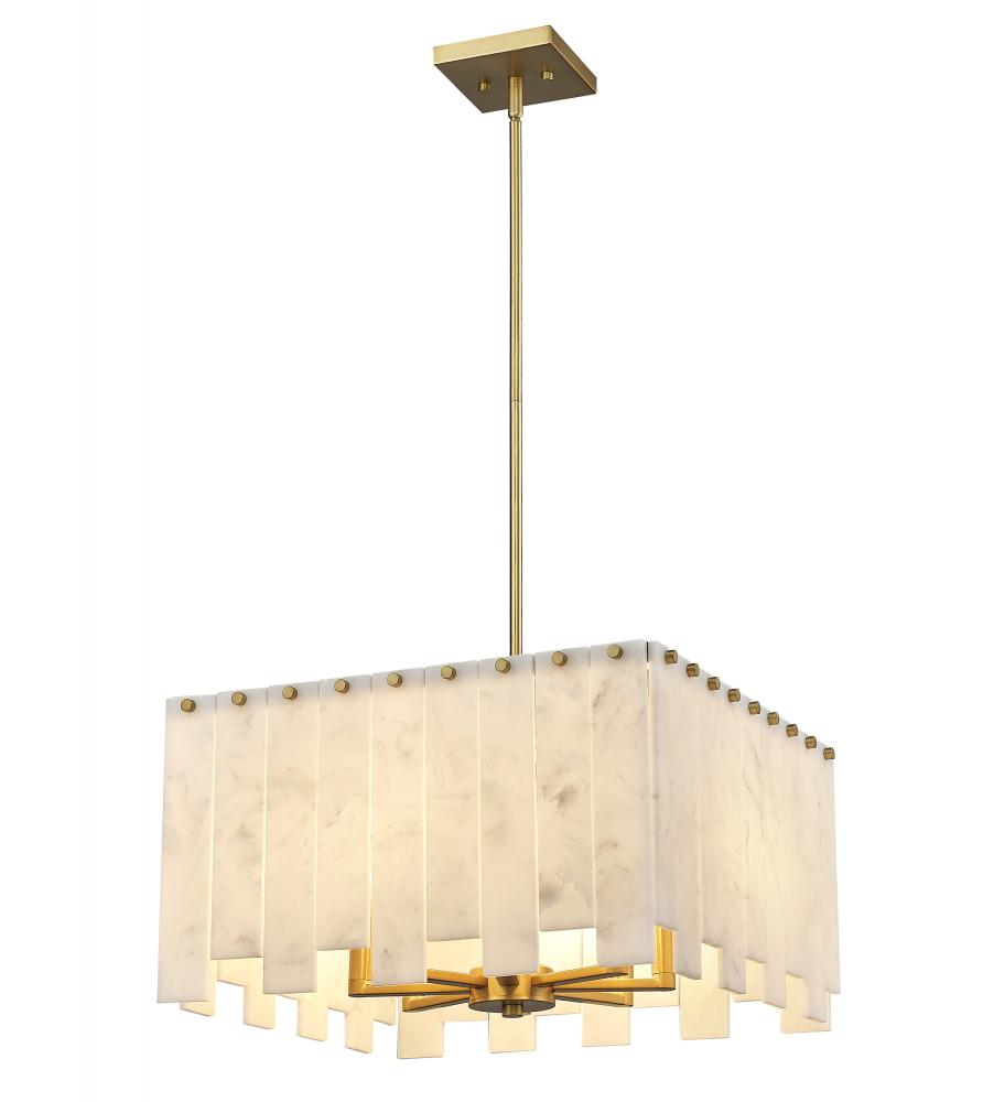 The retro feel of Art Deco style is evident in the styling of a classic fixture with promise. Choose this decadent eight-light pendant from the Viviana collection to deliver impacting ambiance with alabaster-like strips alternating in length and arranged around a squared rubbed brass finish steel frame. Whimsical rivot detailing adds an industrial feel to this pendant that goes with the flow as it complements a gritty rendition of toned-down glam in a kitchen or entryway.
