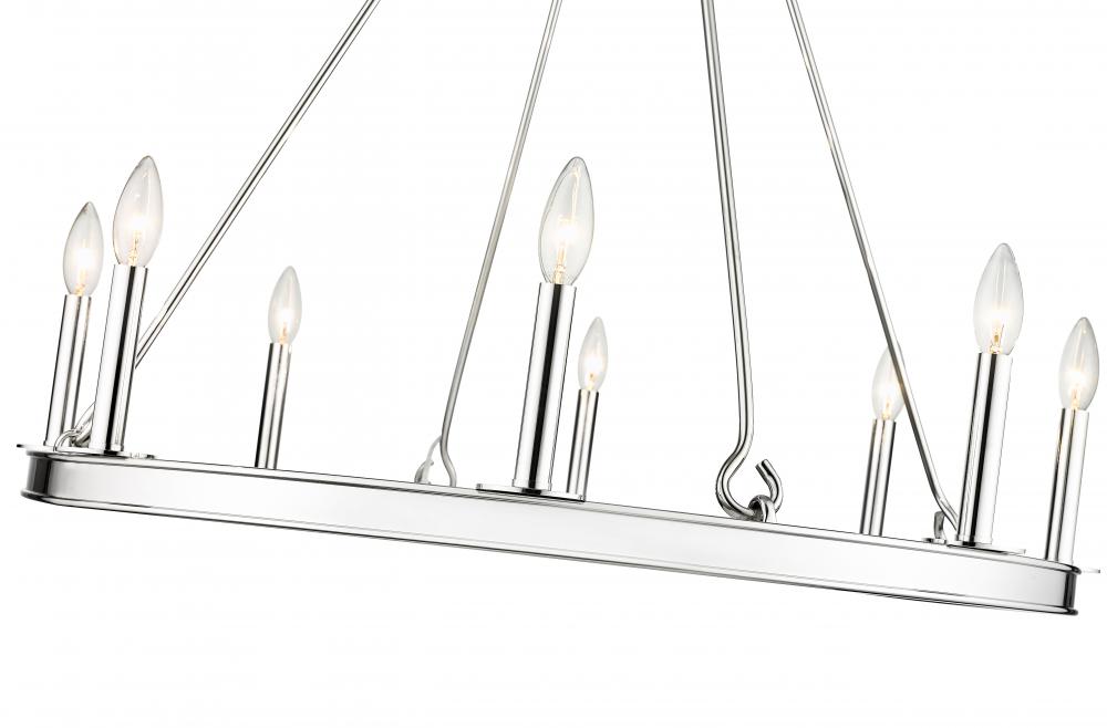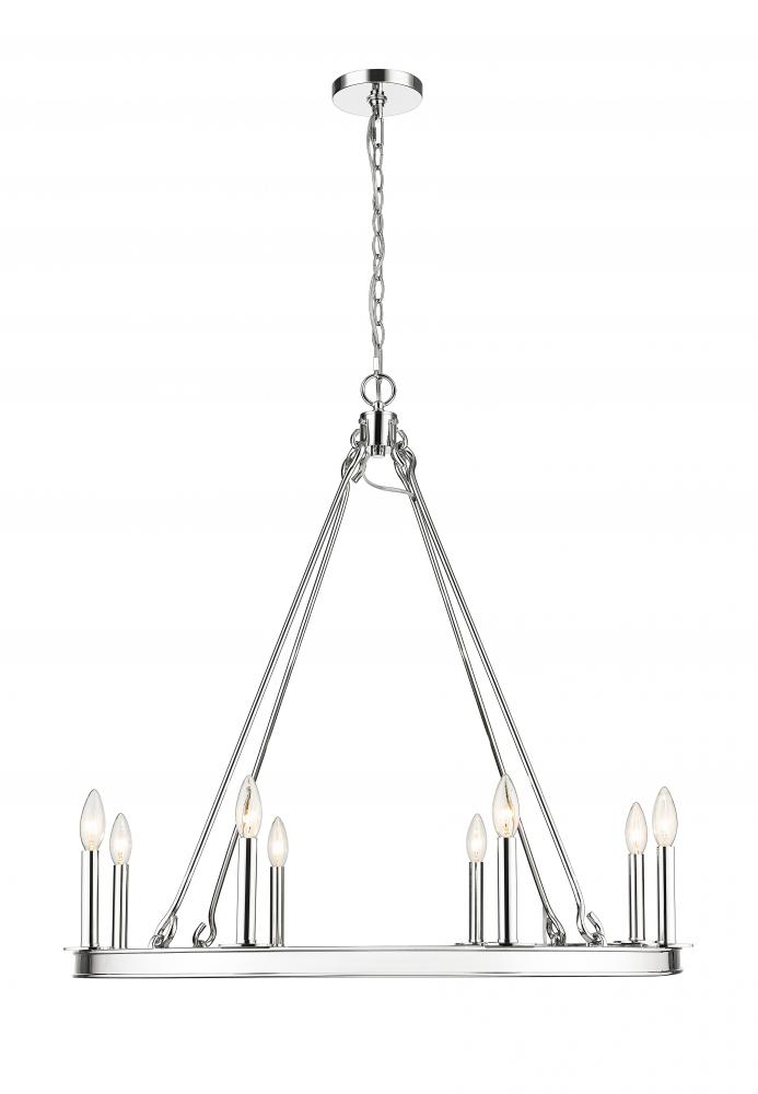 Committed to an extraordinary style impact, this traditional eight-light chandelier delivers on a theatrical motif with gleaming radiance. A classic ring silhouette features construction of polished nickel finish steel, adding versatility to its long list of attributes. Classic round silhouetting suggests a palace theme that speaks to sparkling expressive style in this chandelier offering charming, romantic candelabra bulb mounts.