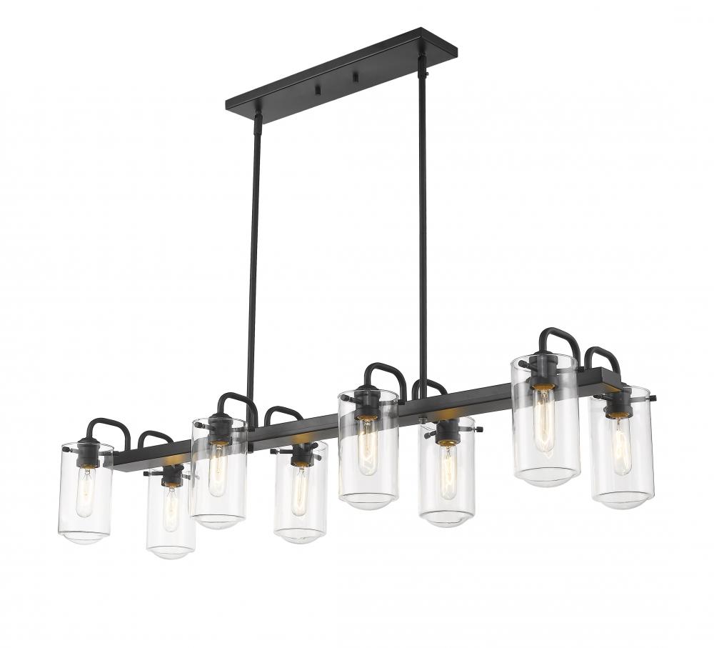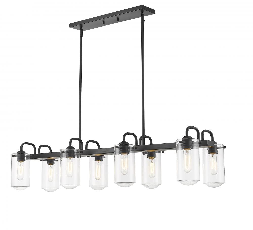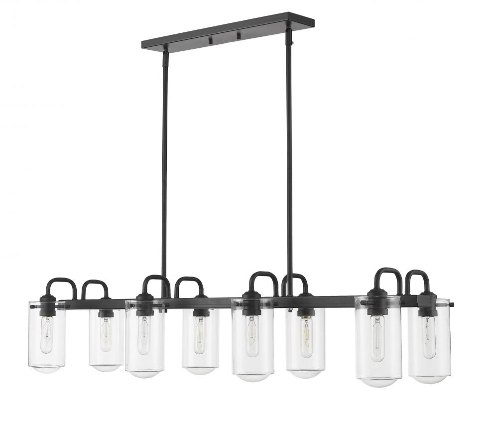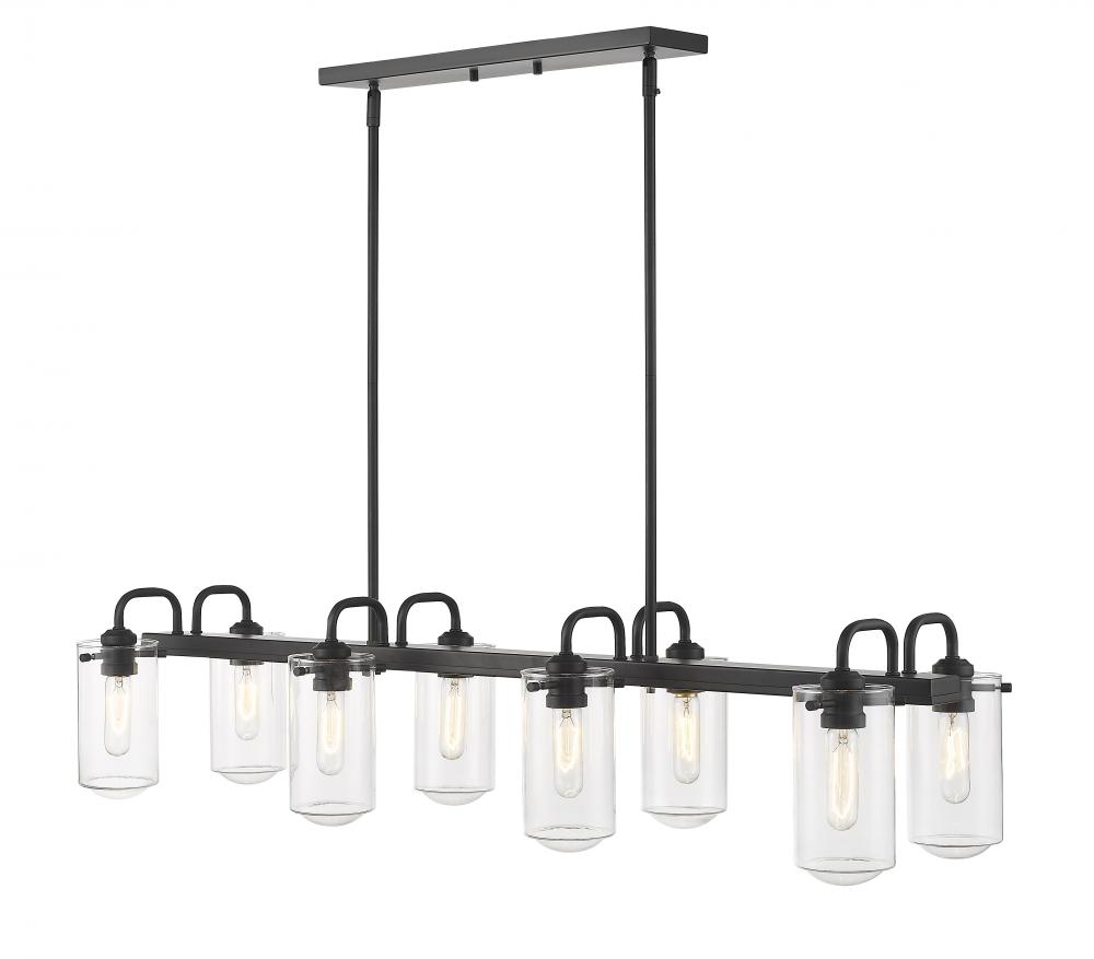 This elegant eight-light island chandelier focuses attention in a kitchen or entertaining space. Enjoy the dynamic contrast of black finish metal and clear glass shades, fashioned in an artful and charming industrial theme.