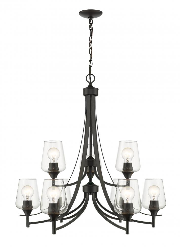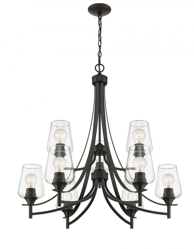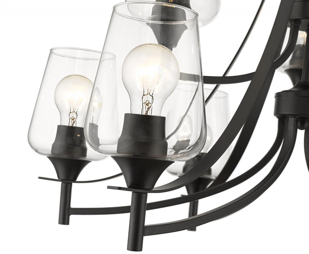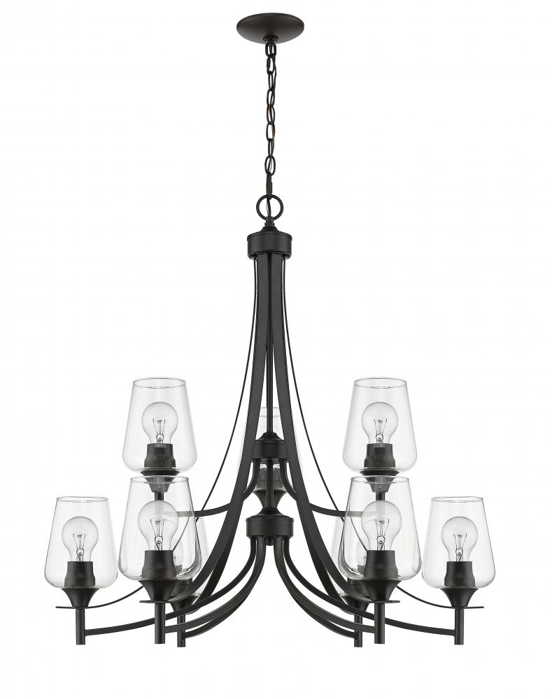 Designed with sleek metal lines and an elegant silhouette, this matte black chandelier is a stunning home decor upgrade. This nine-light fixture features clear glass shades for a magnificent display of light.